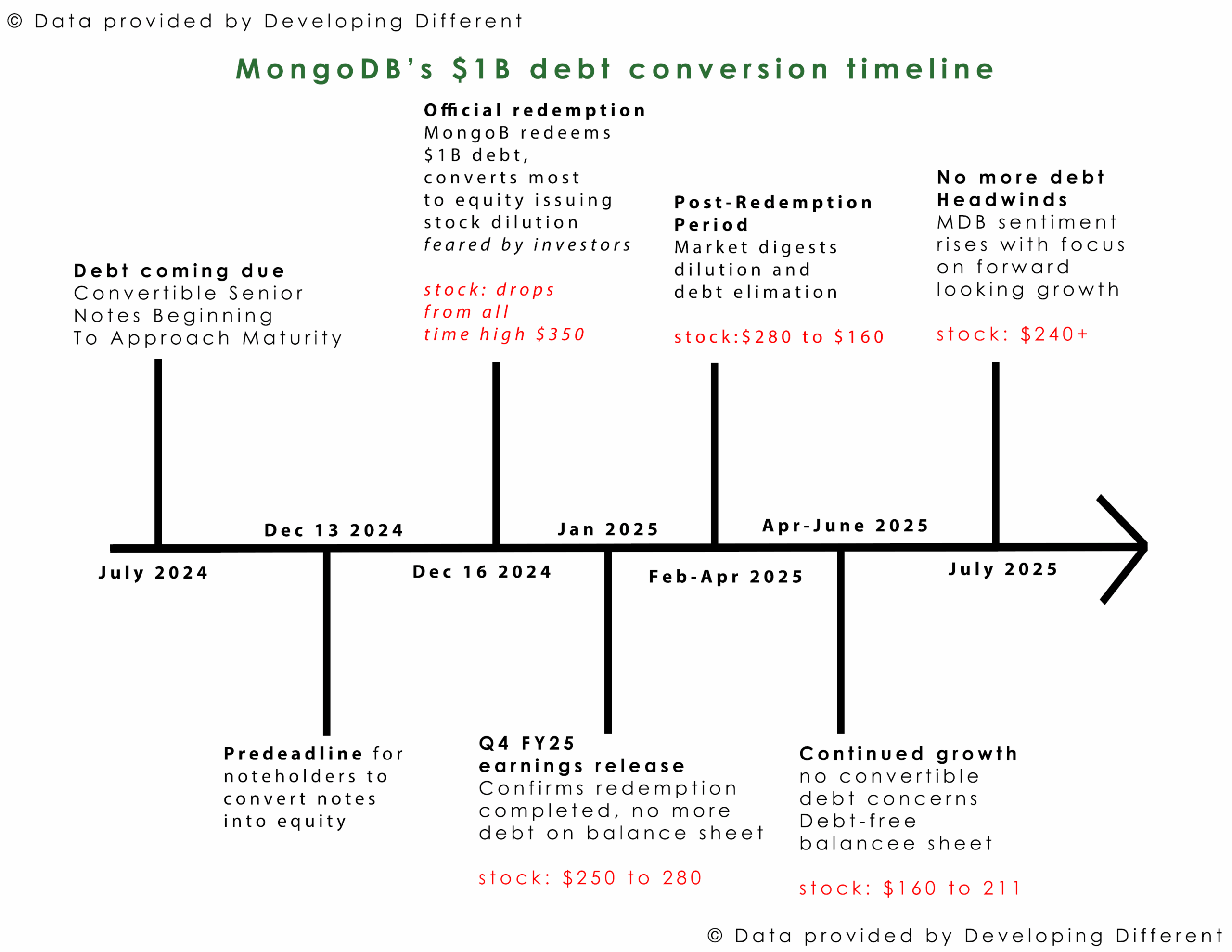 💡 Developing Different insight: an informed investor combing through MongoDB’s financials would have spotted the short-term mounting debt load well before the conversion, anticipating that swapping over $1 billion of debt for equity would double the share count, thereby halving the stock price, before ultimately laying the groundwork for stronger, debt‑free growth.